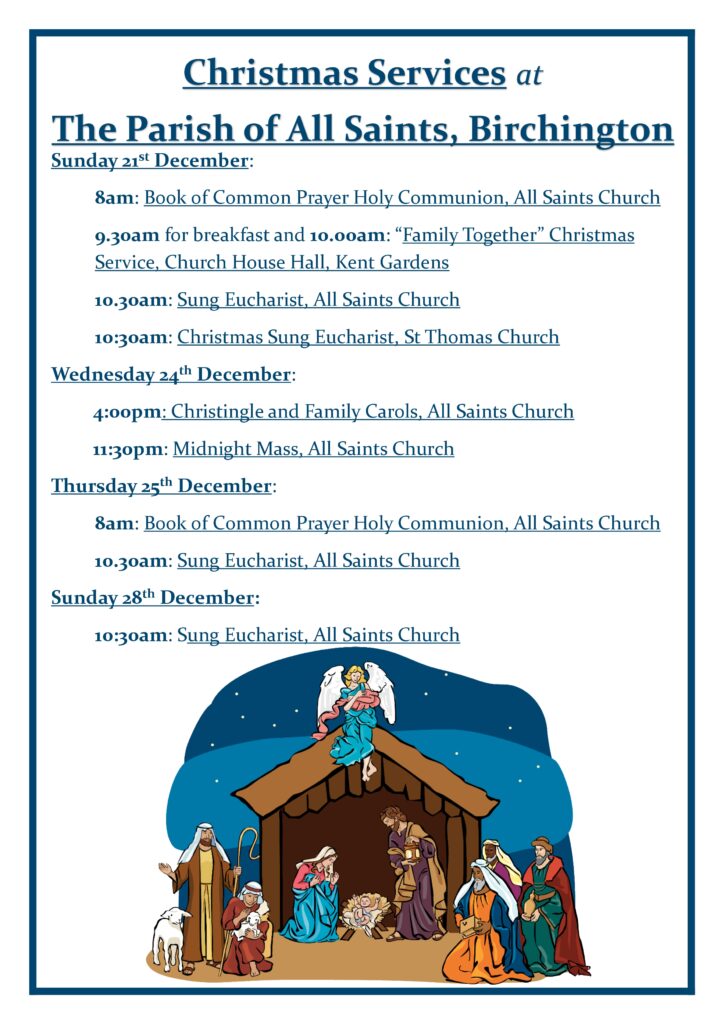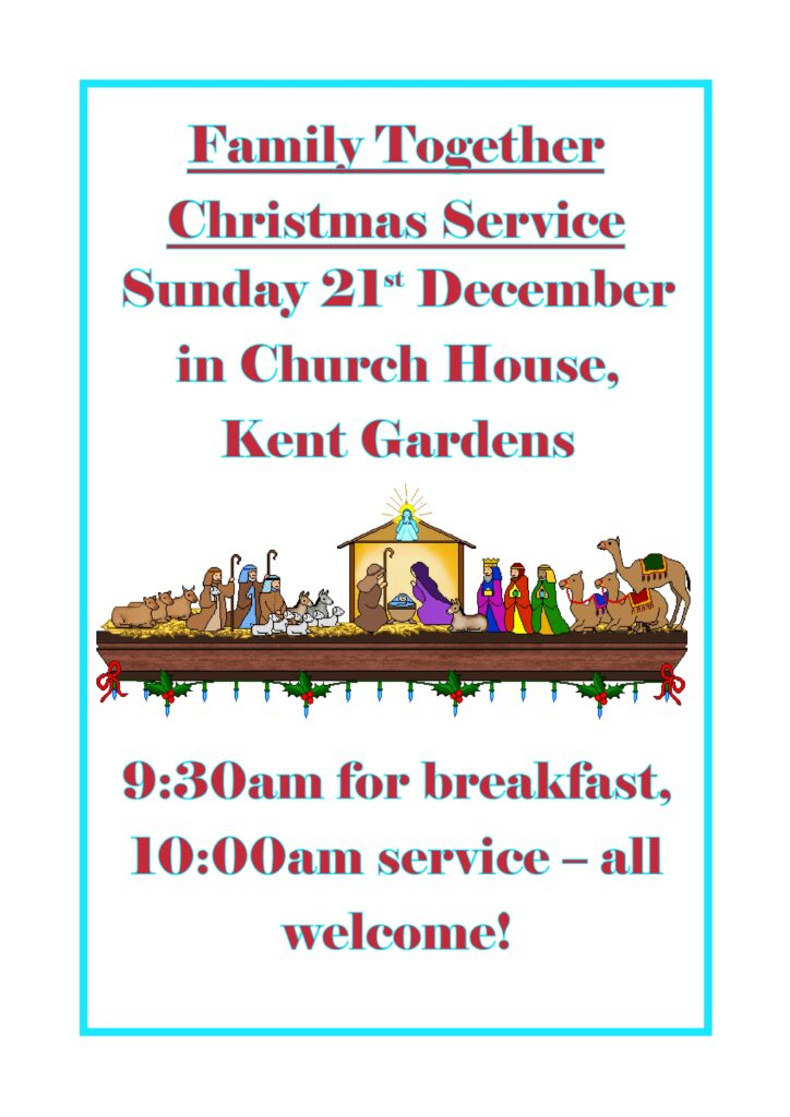 Sunday 21st December: 8am: Book of Common Prayer Holy Communion, All Saints Church 9.30am for breakfast and 10.00am: “Family Together” Christmas Service, Church House Hall,