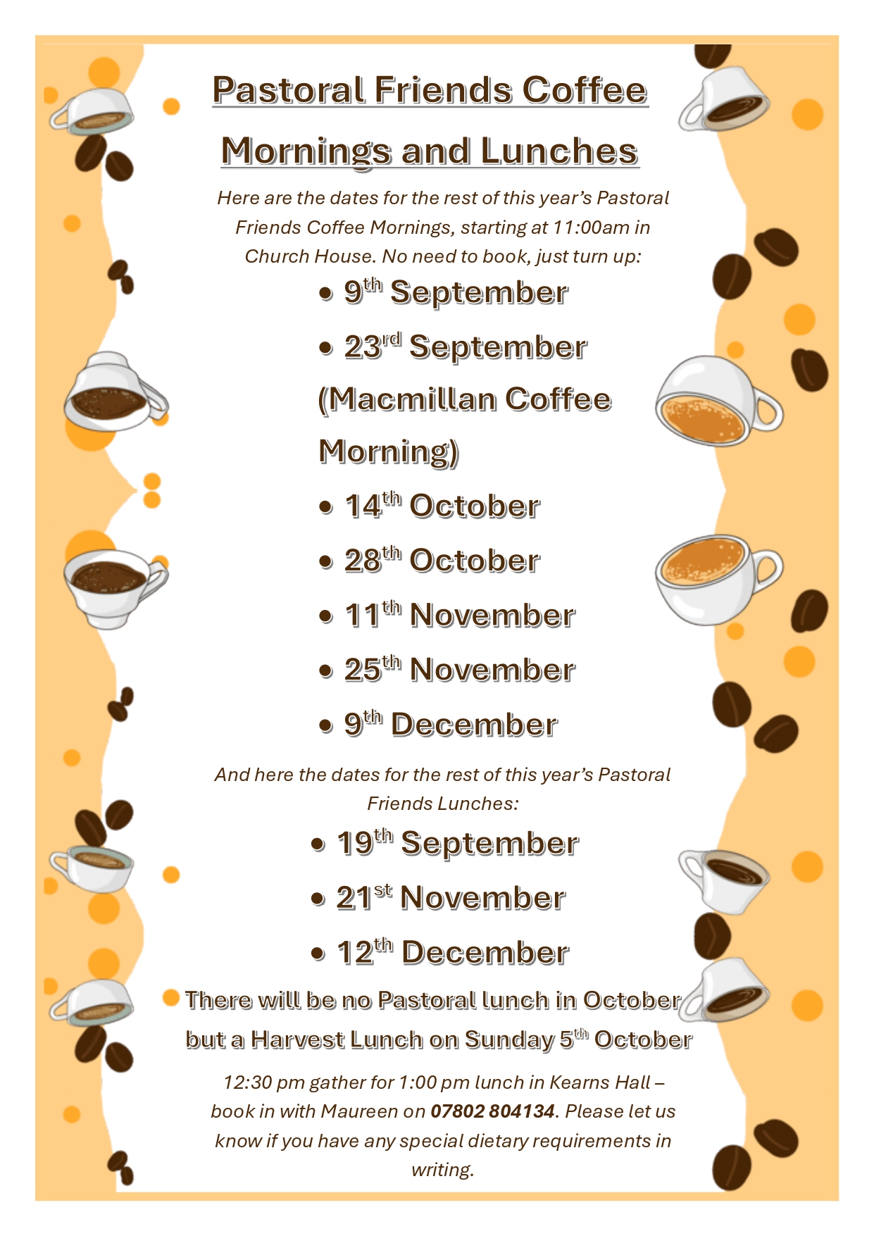 Pastoral Friends Coffee Mornings are held every 2nd and 4th Tuesday at 11.00 am in Church House. The next coffee mornings will be on the 14th and 28th October.